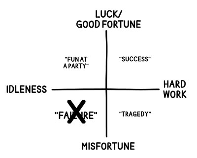 Next week, try this idea. Instead of putting hard work and luck on the same continuum, contrast them on a grid. On the X put hard work at one end, and idleness on the other. On the Y, put luck/good fortune on one end and misfortune on the other. Idleness and misfortune are suboptimal for success, but hard work and luck are not. As for the other two quadrants, hard work and misfortune is the stuff of great novels. Idleness and luck, on the other hand, doesn't seem like a great plan (but you're probably a lot of fun at parties!)